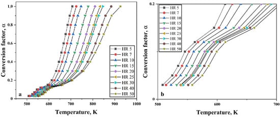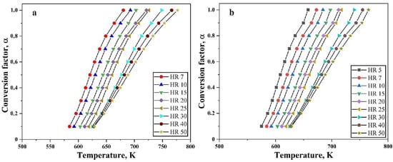 Figure 4 shows the plots with varying degree of conversion for the reduction of the oxide film on the Fe nanopowder under hydrogen atmosphere for different heating rates against temperature. This is calculated based on the evaluation of conversion of the reduction reaction using Equation (3) and the temperature corresponding to the particular α, is taken from the TG curves. The total mass loss recorded from the TG is considered as complete reduction (100%) and total mass loss, in this case 5%, is taken as α = 1.0. Further calculations for different levels of conversion are done based on this.