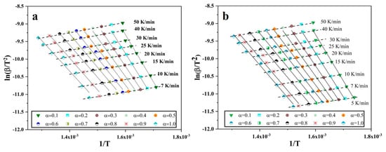 This study used the Kissinger–Akahira–Sunose (KAS) method, for which Equation (9) can be integrated and rearranged as follows: