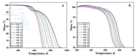 Figure 1 shows the thermogravimetry results for hydrogen-driven reduction of oxide layer on the iron nanopowder. Figure 1a,b shows the heating stage of the reduction for the iron nanopowder size range of 40–60 nm and 60–80 nm, respectively, at different heating rates.