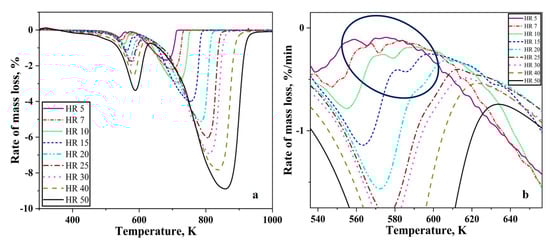 The slope of the TG curves in Figure 7a change as the temperature increases. For the convenience of understanding, the TG curve can be divided into two stages. The first stage corresponds to the reduction of Fe2O3 to Fe3O4 as a mass loss of around 3.5% which is close to the theoretical value of 3.34%. This is the prereduction step in the reduction of Fe2O3 to Fe prior to the second stage where the complete reduction to metal iron occurs. Therefore, the reduction process proceeds in two stages, Fe2O3 → Fe3O4 → Fe. This two-stage reduction agrees well with previous literature studies which report that the reduction proceeds in these two stages [,]. When reduced under isothermal conditions below 843 K, either Fe2O3 and Fe3O4 or Fe3O4 and Fe exist at any point throughout the experiment []. For the same amount of mass loss, at higher heating rates the residence time for the sample is reduced. Therefore, it must lose more mass during the reduced residence time. Hence, we see deeper peaks at higher heating rates. For the DTG curves, the peaks whose maxima is located between 533 and 593 K correspond to the reduction of Fe2O3 to Fe3O4 and the peaks whose maxima is located between 683 and 863 K correspond to the second reduction step from Fe3O4 to metallic iron.