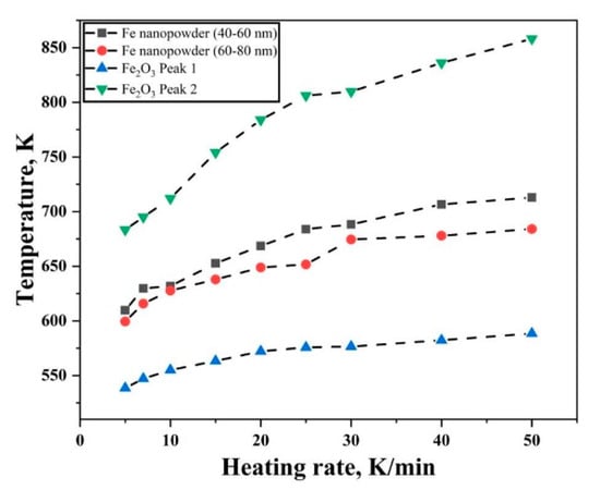 The peak temperatures at different heating rates for Fe nanopowder and Fe2O3 nanopowder experiments are shown in Figure 9. The peak temperatures for Fe nanopowder lie in between the first and the second peaks of the Fe2O3 nanopowder. The scale is composed of Fe2O3 which is reduced in a single step to Fe. The peak temperature for reduction of the oxide film on Fe nanopowder is hence approximately an average of the peak values of the reference Fe2O3 nanopowder.