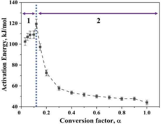There are different isoconversional methods to evaluate at different degrees of conversion, . The Ozawa, Flynn and Wall method uses a plot of verses plot whose slope gives for a particular []. There are other methods like the Friedman method and the nonlinear Vyazovkin method which have their own set of advantages or disadvantages [,].