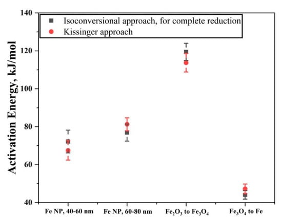 Figure 16 shows a plot comparing the activation energy values using two different approaches. For the isoconversional approach, the values of apparent activation energy were taken when the reduction reaction was complete. The values obtained using two different approaches overlap and are in the range of values from other studies. Although the values obtained using Kissinger method correspond well with the values obtained from isoconversional method for complete reduction, Kissinger method takes absolute temperature values into account. Therefore, it provides a single value for the reduction process. This does not account for the varying activation values as the reaction proceeds and it is the isoconversional approach which offers this in detail.