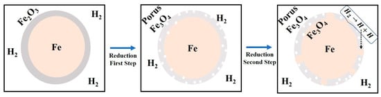 It is generally accepted that the reduction of iron oxide (Fe2O3), in its bulk form, proceeds via a two-step process to convert to metallic Fe. The same was observed even for the powder and particulate forms. For the reaction where iron oxide is reduced to metallic iron, the mechanism followed depends on the conditions chosen for the analysis []. For particulate materials, in the case of coarse particles (millimeter size range), reduction reportedly proceeds via a phase boundary mechanism or topochemical mode of reaction. For finer particles/powder, however, a different reaction mechanism is seen to be operative, particularly at lower temperatures, which is nucleation and growth [].