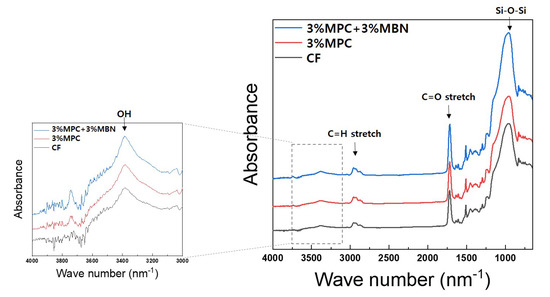 The chemical structures of CF and 3% MPC, 3% MPC + 3% MBN are shown above (Figure 1). For all samples, Si–O–Si and C=O stretching related to CF sample was detected at around 1000 cm−1 and 1700 cm−1 [38,39]. A peak at around 3390 cm−1 was created by OH vibrations. In terms of degree of conversion, there were no statistically significant differences between the groups CF (59.0 ± 2.2%), 3% MPC (56.5 ± 5.1%), 5% MPC (51.3 ± 0.8%), 3% MPC + 3% MBN (52.1 ± 1.7%), and 3% MPC + 5% MBN (59.3 ± 0.1%) (Figure 5).