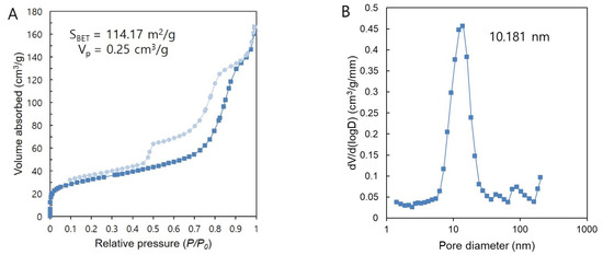 The mesoporous structure of MBN was evaluated using N2 adsorption–desorption isotherms (Figure 4A). MBN exhibited type IV isotherm characteristics (according to the IUPAC classification) with a type-H1 hysteresis loop, which is a feature of mesoporous materials with relatively uniform pores. The pore sizes of MBN were mostly distributed with an average of 10.181 nm (Figure 4B).