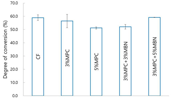 Comparison between degrees of conversion of orthodontic bonding agents containing MPC and MBN. One-way ANOVA was performed (p < 0.05). Error bars are shown ± standard error (n = 15).