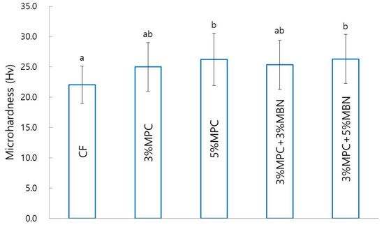 In terms of microhardness, there were significant increases for the 5% MPC (26.3 ± 4.3 Hv) and 3% MPC + 5% MBN (26.3 ± 4.0 Hv) groups, compared to the CF group (p < 0.05, Figure 6).