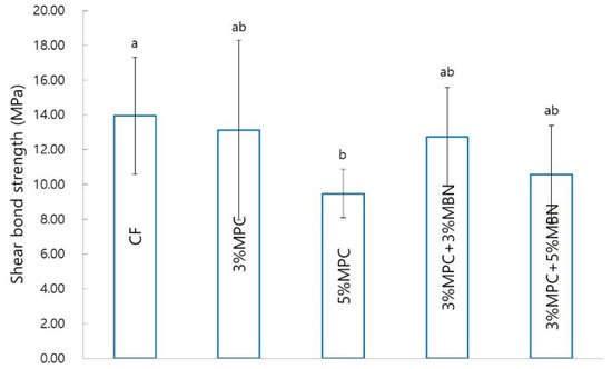 The 5% MPC (9.48 ± 1.39 MPa) group exhibited significantly reduced SBS compared to that of the CF (13.95 ± 3.36 MPa) group. The 3% MPC (13.14 ± 5.18 MPa), 3% MPC + 3% MBN (12.74 ± 2.84 MPa), and 3% MPC + 5% MBN (10.57 ± 2.83 MPa) groups demonstrated reduced average values, but these were not significantly different from those of the CF group (Figure 7).