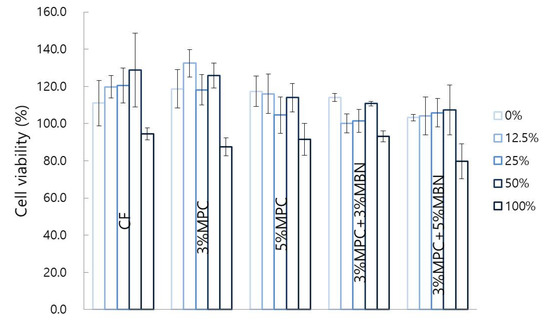 Cell viability was evaluated using 3-[4,5-dimethylthiazol-2-yl]-2,5-diphenyl tetrazolium bromide (MTT; Sigma-Aldrich, St. Louis, MO, USA) colorimetric assay. Human dental pulp stem cells (hDPSc; Lonza, Alpharetta, GA, USA) were purchased from Lonza (PT-5025) and cultured in Dulbecco’s modified Eagle’s medium (DMEM; Gibco, Grand Island, NY, USA) with 10% foetal bovine serum (FBS; Gibco, Grand Island, NY, USA) and 1% antibiotics (penicillin–streptomycin; Gibco, Grand Island, NY, USA). The hDPSc were seeded in a 96-well plate and incubated for 2 h at 37 °C and 5% CO2. The cells were then additionally cultured for 24 h in a continuously diluted extract. Extracts (3 cm2/mL) were obtained via dipping of discs sterilised with ethylene oxide (EO) gas in culture media for 24 h and filtering through a 0.2 μm filter. The extracts were diluted with the medium such that the final concentrations were 0%, 12.5%, 25%, 50%, and 100% [35]. Three samples were used per group. Then, 10 μL of MTT solution (5 mg/mL MTT in sterile PBS) was added to each well, followed by incubation for 4 h at 37 °C and 5% CO2. Later, the solution was replaced by 100 μL of dimethyl sulfoxide, and the colour was read for 5 min at 37 °C. A microplate reader (Sunrise, TECAN, Männedorf, Switzerland) was used to measure the absorbance at 620 nm.