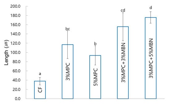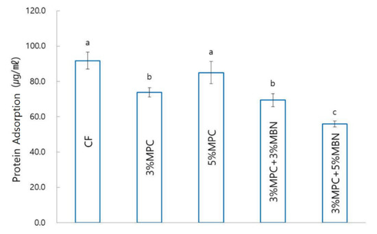 Compared to CF (91.8 ± 4.8 μg/mL), there were significant decreases in protein adsorption for the 3% MPC (73.9 ± 2.6 μg/mL), 3% MPC + 3% MBN (69.4 ± 3.6 μg/mL), and 3% MPC + 5% MBN (55.9 ± 1.6 μg/mL) groups. Of these, the 3% MPC + 5% MBN (55.9 ± 1.6 μg/mL) group had the lowest value (Figure 9).