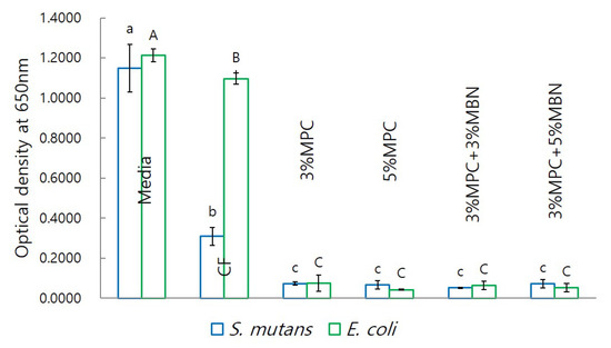 Anti-bacterial test comparison of orthodontic bonding agents containing MPC and MBN. Lower (S. mutans) and upper (E. coli) case letters are used to distinguish different bacteria group. Labels with the same letters indicate no statistically significant differences between the groups (p > 0.05), as determined via one-way ANOVA. Error bars are shown ± standard error (n = 3).