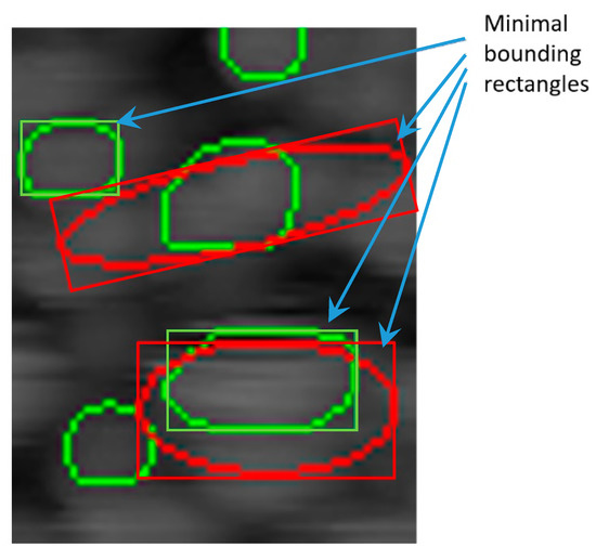 Finally, the width and height of each particle was calculated as the length and width of minimal bounding rectangles for the predicted contour and for the refined contour.
