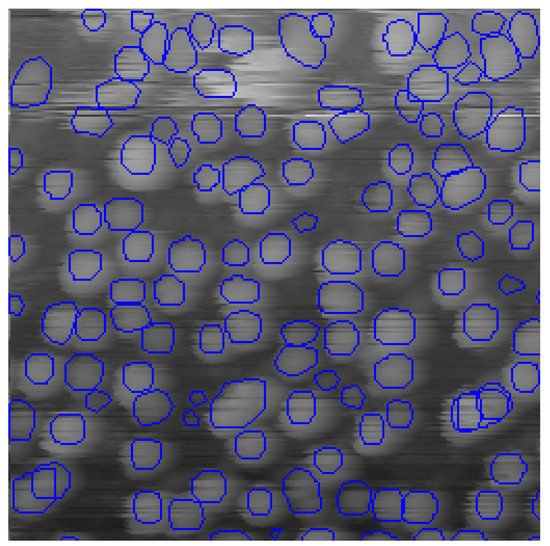 It is reasonable to compare the results of particle recognition by the trained neural network with use of software that is not based on deep learning algorithms. Unfortunately, advanced semiautomatic tools, which include preprocessing (averaging and/or background subtracting), level-based segmentation and edge detection [20,22] are not generally available. So, we used the “flooding” procedure in WSxM software products. The procedure highlights areas that are higher than the threshold defined by the operator [7].
