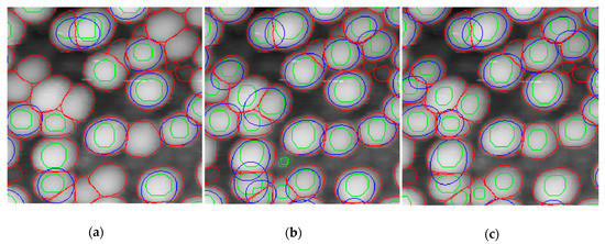 The results of particle recognition on an image from the test dataset by X-101-64 × 4d-FPN backboned Cascade Mask-RCNN network trained on 1-, 2- and 3-times rescaled training images of the “rough” dataset, (a), (b) and (c) correspondingly. Ground truth contours are red, predicted contours are green and Gaussian fitted contours are blue.
