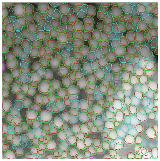 A Cascade Mask-RCNN network powered by an X-101-64 × 4d-FPN backbone was trained on a” precise” dataset using a 3× rescale of the training images (last line in Table 1). While there was a small loss in the number of correctly determined particles, we observed a huge jump in mAP. Visual inspection reveals a very good correspondence of predicted contours with ground truth counterparts (Figure 6, Figure 7 and Figure 8). We attribute the slightly lower mAP value of 27.9% as compared with state-of-the-art mAP of about 40% for the Cascade Mask-RCNN fitting of the COCO dataset [28] to the small size of the training dataset.