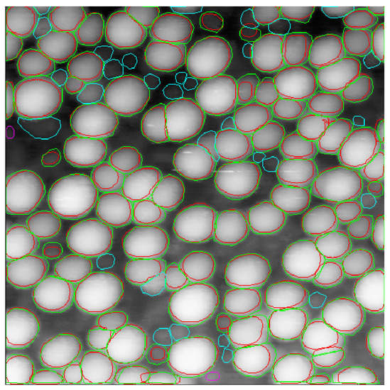 STM image of nanoparticles from the test dataset with 172 ground truth contours and 190 predicted contours. The true positive predicted contours are marked red, corresponding ground truth contours are green, false positive ground truth contours are pink and false negative ground truth contours are cyan. Image 3, backbone type X-101-64 × 4d-FPN, scale 3×, “precise” training dataset.