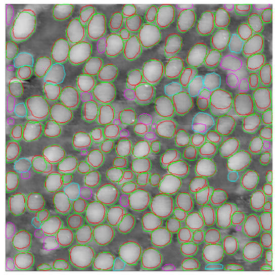 STM image of nanoparticles from the test dataset with 377 ground truth contours and 272 predicted contours. True positive predicted contours are marked red, corresponding ground truth contours are green, false positive ground truth contours are pink and false negative ground truth contours are cyan. Image 1, backbone type X-101-64 × 4d-FPN, scale 3×, “precise” training dataset.