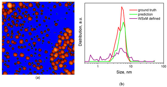 Processing of Image 1: (a) Results of the application of the “flooding” procedure in WSxM software products; (b) Size distributions of the 196 contours defined by WSxM software (purple), 272 particles recognized in our work (green) as well as 377 contours of ground truth (red), x-scale presented in log10 units.
