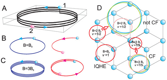 (A) An illustration of the commensurability of the three-loop cyclotron orbit with the separation of two closest particles, shown as blue and red. (B) An illustration of single-loop cyclotron orbit (left) and related braid for exchange of two closest particles, shown as blue one red—the braid is built from the half of the cyclotron orbit. (C) An illustration of thee-loop cyclotron orbit (left) and related braid for the exchange of two particles blue and red—in this case, the braid gains one additional loop (the third dimension added for clarity of the vision, more detail in Ref. [5]). (D) An illustration of the commensurability in Wigner-type lattice of electrons in graphene monolayer. Several situations are illustrated. The single-loop cyclotron orbit commensurability with nearest neighbors corresponding to IQHE at field . At three-times larger field the single-loop orbit is too short to match nearest neighbors in the Wigner lattice—but the three-loop orbit fits to nearest neighbors. This corresponds to FQHE at . For field single-loop orbit is also too short in comparison to the electron separation. In this case the homotopy pattern with (cf. Table 2) allows fulfillment of the commensurability condition but for next-nearest neighbors for two loops—hence, this state is of FQHE type at , but not accessible for the CF model. The envelope function of multiparticle states in graphene is distinct than the envelope function in GaAs. In graphene this envelope function favors next-nearest neighbor correlations, which manifest itself in stability in graphene of FQHE at beyond the CF model [47,55].