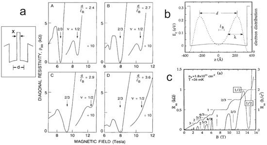 - Eisenstein, P.; Boebinger, G.S.; Pfeiffer, L.N.; West, K.W.; He, S. New Fractional Quantum Hall State in Double-Layer Two-Dimensional Electron Systems. Phys. Rev. Lett. 1992, 68, 1383. [Google Scholar] [CrossRef] [PubMed]