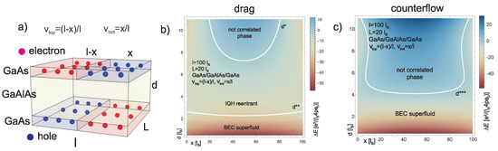 Another situation is in the so-called drag configuration when the layers are not connected at any point. The drive-current in the upper layer pulls electrons and their stripes in one direction in this layer. The electrically coupled alternatively aligned stripe structure in the bottom layer is dragged in the same direction allowing the same energy trade-off as in the static case. Both IQHE-reentrant state and exciton BEC superfluid are possible here and the phase diagram displays energy competition between these phases—as shown in the Figure 3b).