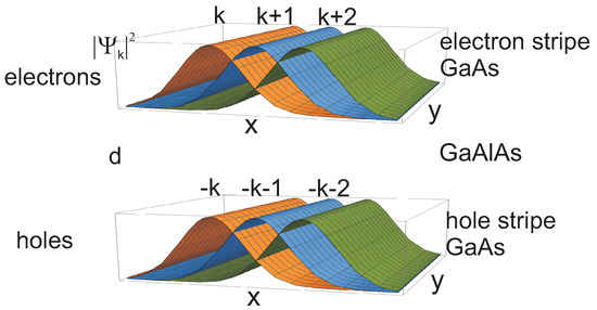 Pictorial presentation of k striping of electrons and holes in opposite layers. Charge density of the electron, according to wave functions given by Equation (10) for k state, is exactly the same as of the hole in state. To allow exciton formation, the consecutive states ordered as represented by their density, , in the figure in compliance with Equation (10) must by aligned perfectly in front of oppositely ordered states of holes, .