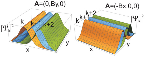Depending on the gauge of magnetic field B the shape of the electron and hole densities, as given by Equation (10) for the Landau gauge, changes as shown in the figure for two variants of the gauge, and . The striping in the k space is not attributed thus to fixed orientation, due to the gauge invariance.