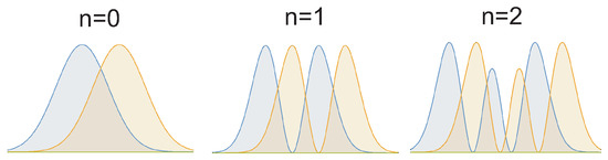 where is the Hermite polynomial, for electrons and for oppositely charged holes (holes are here considered to be unfilled states in the LL sub-band, are positively charged due to the positive jellium), distinguishes between the top and bottom layers (magnetic length is put 1 in (10), for abbreviation). From Equation (10) it is visible that electrons and holes in the opposite stripes have perfectly mirrored alignment of states if k is changed for , i.e., electron and holes are oppositely ordered along the x direction, which is admissible due to degeneracy of LLs. The density of charge of the negatively charged electron k in upper layer is located perfectly opposite the same shape density of positively charged state of the hole in bottom layer, or vice versa, cf. Figure 4. These charge distributions attract mutually themselves across the barrier of thickness d with energy ( is the permittivity of the barrier). In the case when both charge distributions of electron and hole mutually cancel themselves resulting in neutral exciton (if one neglects here their recombination). The barrier prevent the recombination but causes that both charge densities do not perfectly cancel, and the resulting excitons interact with neighbors. This interaction is of repulsion type and reflects the residual repulsion of ordered states in stripes (10) both of electrons and of holes. Attraction may occur only on borders of stripes, which is negligibly small. This repulsion of indirect excitons created by Landau electrons and holes is very important—is needed for the superfluid transition of BEC [80].