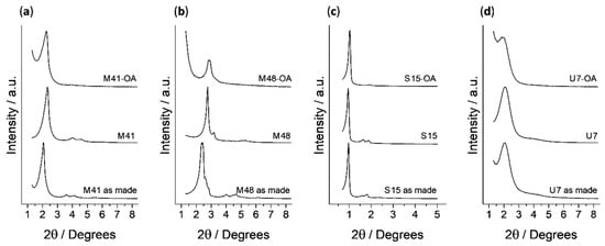 Normalized powder X-ray patterns of all the synthesized solids. From left to right, (a) MCM-41, (b) MCM-48, (c) SBA-15 and (d) UVM-7 materials. From bottom to top: as made, calcined, and the loaded and functionalized final material (MSP-OA), respectively.