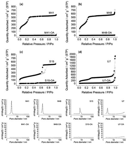 Top: Nitrogen adsorption (○)–desorption (●) isotherms for all the calcined and final solids (a) MCM-41, (b) MCM-48, (c) SBA-15, (d) UVM-7. Bottom: Pore distribution graphs of all the calcined and final solids (MSP-OA), indicated in its own graph.