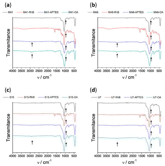 Infrared spectroscopy (FTIR) was also employed to follow the loading and functionalization processes leading to solids MSP-OA (see Figure 4). In all the FTIR spectra, the dominant bands are those due to the silica matrix (1060, 800 and 450 cm−1) giving rise to very similar spectra between them. However, some changes in minor bands can be related with the presence of specific organic groups in solids functionalized with APTES or OA. Consequently, it can be observed the decrease of the band around 950 cm−1 assignable to the silanol groups of the inorganic surface when the APTES group is anchored. Furthermore, it is visible the appearance of two bands at approximately 2900 cm−1 and 2850 cm−1 assignable to C–H bending vibrations. It can also be observed that these two bands increase as the amount of functionalized organic groups increase.