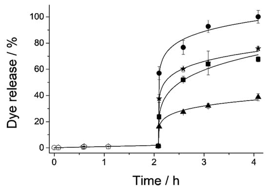 In addition to achieving a notable cargo release triggered by the surfactant action of bile salts, it is also an important objective of this work to evaluate the ability of the studied systems to control the payload release, and distinguish whether it is bulk or sustained over time. For this purpose, the release kinetics data of the first 60% of the payload (data in Figure 6) were adjusted to four different mathematical models: zero order, first order, Higuchi and Korsmeyer–Peppas (K–P). All mathematical equations (Equations (1) – (4)) are detailed in Section 2.6 in Materials and Methods. In each of these models, certain premises are assumed, and different parameters are taken into account to describe the release process. The zero order model describes immediate and constant time release processes, usually of very soluble drugs in aqueous media. The first order model considers the change in concentration of the payload over time, associated with a decrease in the concentration of the drug in the initial support. Higuchi’s model, developed in the 1960s, marked a revolution in the modeling and understanding of drug release, since the matrix from which cargo is released was considered for the first time. This model is based on the premise of a uniform insoluble matrix with a cargo concentration much higher than the one released. Additionally, in this model, it is contemplated that the external medium penetrates to dissolve the loaded drug, which is unidirectional and constantly released. Finally, the semi-empirical model of K–P or “power law” consists of a modification of the Higuchi model with the aim of making it more general. It is applied for drug release from matrices in which several phenomena occur simultaneously, not only diffusion. Two parameters are obtained from the mathematical adjustment of the data to this equation: K, which is the constant related to the cargo’s diffusion velocity, and n, which is related to the type of diffusion and can be n = 0.45 in case of Fickian diffusion from cylindrical shaped pores, or 0.45 < n ≤ 0.89 if the diffusion is non-Fickian [].