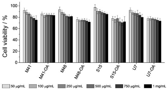 In addition to the cargo release experiments from the four different supports, it was also an objective of this study to assess the biocompatibility of the developed microsystems. Therefore, studies with all the bare MSPs and final loaded-and-functionalized solids (MSP-OA) were performed employing Caco-2 human colon adenocarcinoma cells in order to exclude any toxic effect of microparticles. Other studies in the literature reported low toxicity levels for similar mesoporous materials at low particle concentrations [], reason why cells in this work where exposed to higher—even critical—particle concentrations. Thus, cells were treated with the corresponding system for 24 h at final concentrations of 50, 100, 250, 500, 750 and 1000 μg/mL. After this time, a cell viability assay using MTT was performed, which is based in the absorbance measurement of formazan produced by oxidoreductase enzymes of viable cells []. The formazan crystals generated are insoluble in the growing medium, so DMSO solvent must be added after medium-removal in order to solubilize the generated compound. The absorbance of the resulting purple solution was measured at λexc 550 nm and compared with the one achieved by control cells. The obtained results are depicted in Figure 7.