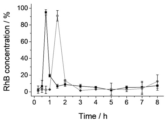 To perform the pharmacokinetic studies, male Wistar rats were divided into two groups (see Section 2.10 in Materials and methods). The subjects in group 1 were treated with 2 mL of RhB solution (0.84 mg/mL), and rats from group 2 were treated with 2 mL of a suspension of U7-OA microparticles (containing 150 mg of solid, which release 1.67 mg of RhB). RhB concentration in plasma as a function of time for both groups of rats is shown in Figure 8. As it could be seen, subjects from group 1 (that received the RhB solution) showed maximum concentration of the molecule (Cmax) at 45′ after administration (black line); however, rats in group 2 presented maximum RhB levels at 1.5 h (gray line). Due to the high permeability of RhB through the intestinal membrane, the delay of the maximum concentration of this molecule in plasma can be related to the retard of its delivery in the duodenum. Thus, in group 1, the RhB absorption is almost immediate after gastric emptying, while RhB encapsulated into the U7-OA microdevice will only be adsorbed after the bile salts have produced the opening of the microdevice and the dye release. Then, we can assume that the RhB is effectively encapsulated and protected during the initial steps of the GIT (i.e., the mouth and the stomach). This strategy can be useful for drug administration, in order to avoid stomach damage or degradation of the compound.