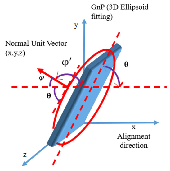 Using confocal optical sectioning, an image of a section is captured from the PE-GnP composite sample. The section is in the x-y plane with thickness along the z direction. Stacking such sections creates a 3D image of the sample. From the 3D image, average angle between GnP and stretching direction can be measured using ImageJ software v1.53c. To find out the angle, all slices within a certain thickness are used for detecting GnP particles in each image. Using the 3D object counter tool in ImageJ software, the 3D particles were detected. Then, the 3D ellipsoid fitting tool within the software is used to fit ellipsoids to individual particles. The tool provides detailed quantitative information for each ellipsoid, including its orientation. Specifically, the coordinates of three main elongation axis of 3D ellipsoids are provided. The vector of the shortest elongation axis is considered as a normal vector to the ellipsoid and provides a way to quantify orientation of the ellipsoid, as shown in Figure 4. The direction angle of the normal vector with respect to the stretch direction is calculated using the formula, , where is the direction of applied strain. The angle between the graphene nanoplatelet and alignment direction is θ = 90° – φ. The average angle is measured by calculating angles of orientation for approximately 3000–4000 GnPs for each sample. Analysis was repeated for different locations within a sample and for samples with different weight percentages of GnPs and for different strains varying from 0% to 300%.