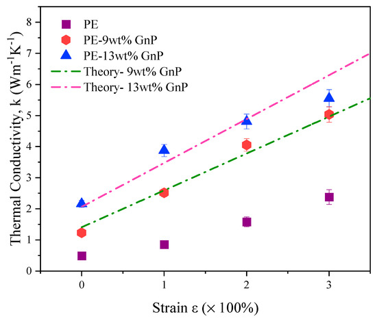 Measured thermal conductivity values of PE-GnP composites with 9 wt% and 13 wt% GnP content with strains between 0% to 300% are displayed in Figure 5. Thermal conductivity values for pure PE are also presented for comparison.
