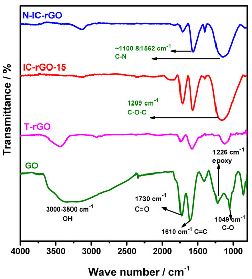Fourier transform infrared (FTIR) spectroscopy is a useful technique for qualitatively identifying surface functional groups that are present in graphene-based nanomaterials. FTIR spectra were recorded using a Thermo Scientific spectrometer. An example is demonstrated in Figure 3, which displays the FTIR spectra of GO, 2D T-rGO, and 3D IC-rGO. In the obtained spectra, the existence of characteristic peaks at 3000–3500 cm−1 (hydroxyl, OH group), 1730 cm−1 (carbonyl, C=O group), 1610 cm−1 (C=C), 1226 cm−1 (epoxy), and 1049 cm−1 (alkoxy) were evidenced for GO. However, upon reduction by a thermal method, the formation of T-rGO and IC-rGO resulted in a weakened OH peak, which confirmed the efficient removal of oxygen functional groups. The extensive removal of oxygen functional groups during heat treatment under an inert environment results in 2D crumpled sheet-like morphologies. Compared with 2D T-rGO, the FTIR spectrum for 3D IC-rGO displayed a strong absorption peak at 1209 cm−1, which could be assigned to the formation of ethers and esters (C–O–C). The formation of ether and ester groups may play an essential role toward interconnecting functionalized GO sheets to form 3D IC-rGO. In N-IC-rGO, the C–N stretching bonds appeared at approximately 1100 and 1570 cm−1, which confirmed successful N-doping [88,89]. In addition, decreases in the intensity of C=O stretching bands indicated a further reduction of functional groups during the N-doping process. Furthermore, sustained C–O–C bands confirmed the preservation of interconnected 3D structures following N-doping.
