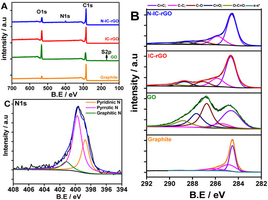 (A) XPS survey spectra of graphite, GO, IC-rGO, and N-IC-rGO. (B) High-resolution (HR) C1s spectra of graphite, GO, IC-rGO, and N-IC-rGO. (C) High-resolution N1s spectra of N-IC-rGO. (adapted from ref. [78,81], with permission from Royal Society of Chemistryand Elsevier, 2017 and 2020).