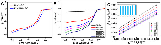 Furthermore, we investigated the effects of metal nanoparticle deposition on the 3D N-IC-rGO. Pt/C is a state-of-the-art catalyst for ORR; however, it is expensive and scarcely available. Therefore, we selected Pd, which is cheaper than Pt. We aimed to improve the mass activity of Pd by anchoring it on an active 3D N-IC-rGO catalyst. Figure 9A,C present ORR results for N-IC-rGO and Pd-N-IC-rGO.