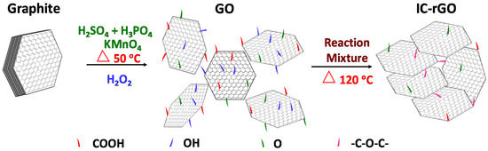 Our research group developed an innovative one-pot approach for the synthesis of interconnected reduced graphene oxide (IC-rGO) without the addition of cross-linked molecules, which we referred as a Streamlined Hummers Method (SHM) [78]. As shown in Scheme 2, IC-rGO was synthesized using the following two steps. In the initial step, 2.0 g of graphite and 200 mL of a 9:1 v/v proportion of sulfuric acid and phosphoric acid were mixed and stirred for 2 h at 50 °C. Subsequently, 9.0 g of potassium permanganate was gradually added, and the reaction was proceeded with stirring for an additional 15 h. Following that, the reaction mixture was cooled to 10 °C in an ice bath, after which 2.5 mL of 30% hydrogen peroxide was poured into the cold reaction mixture. Then, a fraction of the reaction mixture was separated from the first stage of the process to obtain GO. In the next step, the remaining reaction mixture was heated to 120 °C for 15 min to form the IC-rGO. The as-prepared GO and IC-rGO were washed with pure water, HCl, and ethanol, coagulated in diethyl ether, and then dried in a hot air oven at 50 °C overnight. Despite the long-existing method being available in the literature for the oxidation of graphite [79,80], most of the experiments were conducted under 90 °C. In our case, the reaction was carried at two different temperatures, where 50 °C was maintained for the first step, which was followed by the reaction temperature being increased to 120 °C in the second step. As GO possesses –OH and –COOH functional groups, the acid-catalyzed condensation process can spontaneously occur at 120 °C during the second step, which enables covalent linkages between graphene sheets via the formation of ether and ester groups. Our results revealed that a significant quantity of oxygen functional groups was removed from the GO that was formed during the first step, and the interconnection of the GO sheets was simultaneously enabled through an acid-catalyzed condensation process without the addition of external linkers by simply increasing the temperature from 50 to 120 °C.