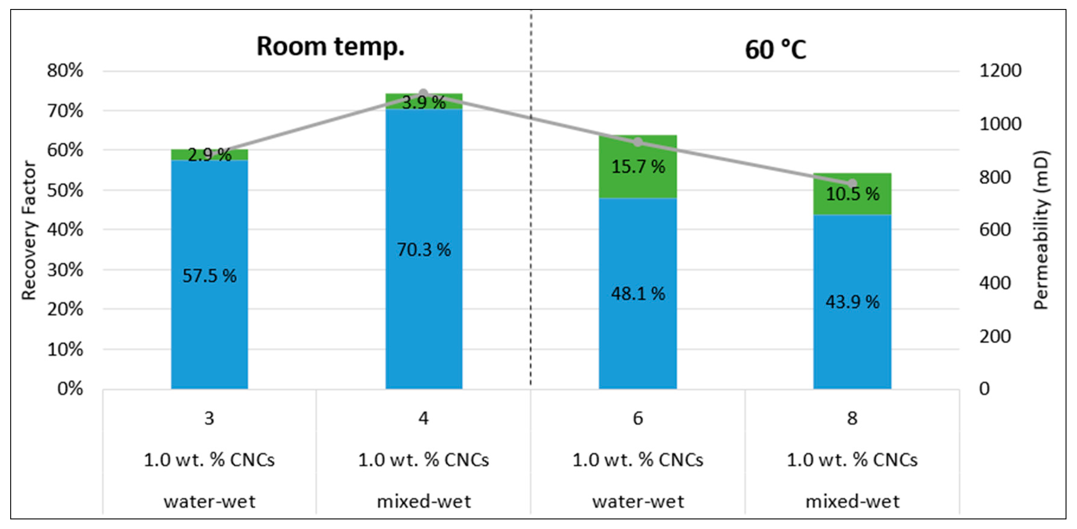 - The oil recovery was enhanced when CNC nanofluid was injected as a tertiary recovery technique, where more incremental oil was produced for the high-temperature floods. For the tertiary floods, there did not seem to be an overall trend regarding rock wettability and oil recovery.
