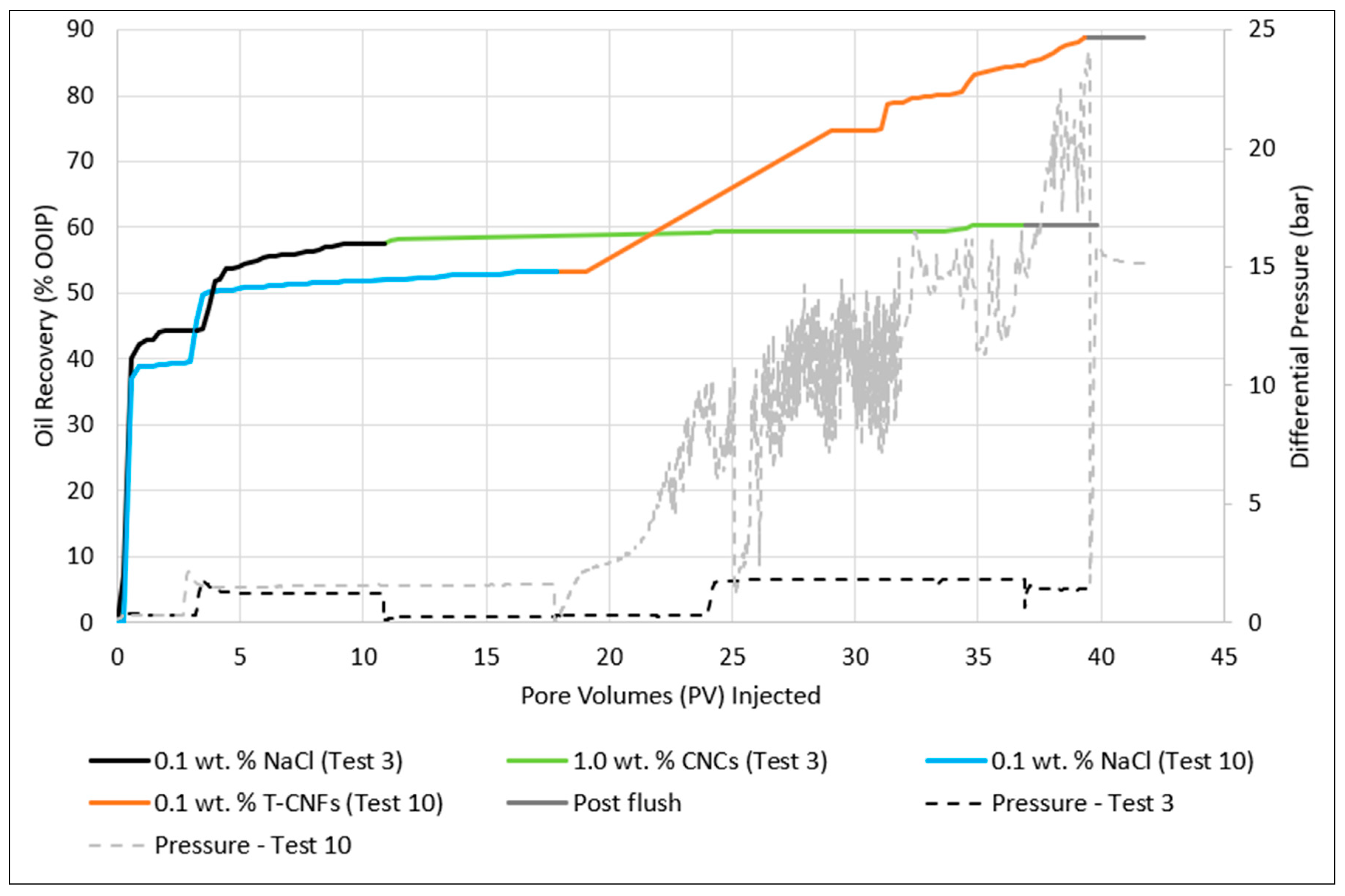 - Looking at the effect of particle type, T-CNFs were much more effective than CNCs to recover trapped oil. This was evident from both core flooding and microfluidic experiments. However, the pressure was constantly increasing during the high rate T-CNF core flood. Even though more oil was recovered during the T-CNF flood, the high pressure indicates poor injectivity. Furthermore, filtering of particles was observed on the inlet side of the core plug after the experiment. Future experiments should, therefore, test T-CNFs at a lower concentration, to see if a similar high incremental oil recovery can be achieved with a lower and more stable pressure profile.