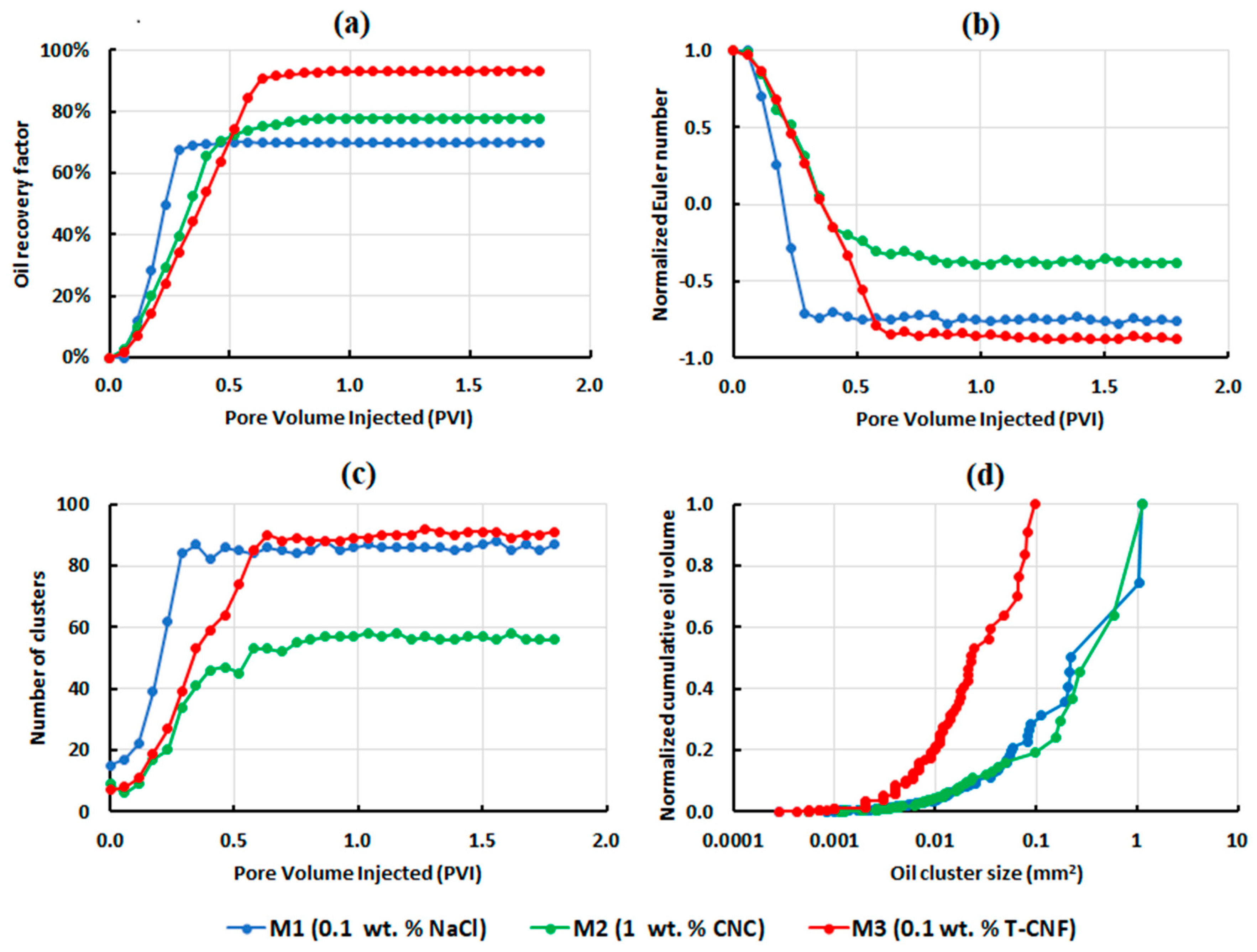 - The microfluidic experiments supported the findings from the core floods, with nanofluid leading to a better sweep efficiency compared to low salinity flooding. T-CNFs improved the oil recovery the most, by breaking up large oil clusters and mobilizing them. Looking at the effect of the flow rate, it was evident that a higher flow rate resulted in lower oil recovery factors and higher remaining oil connectivity.