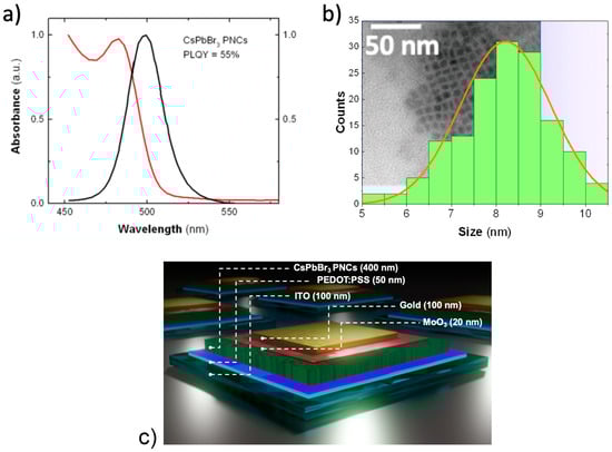 (a) UV-visible and PL spectrum of synthesized CsPbBr3 perovskite nanocrystals (PNCs); (b) size distribution of CsPbBr3 PNCs as extracted from TEM images as the one shown in the inset; (c) schematic representation of the device architecture.