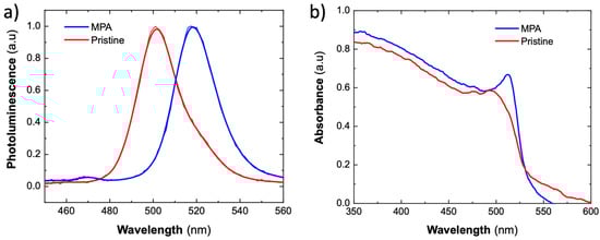 Optical characterization of the 350–400 nm CsPbBr3 PNCs 400 nm layers before (red curves) and after 3-mercaptopropionic acid (MPA) ligand exchange (blue curves). (a) Photoluminescence, measured by backscattering and collecting to a spectrograph. (b) UV-Vis absorbance spectra.