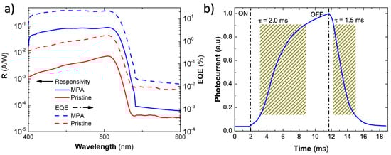 Dark conductivity (), photoconductivity (Δσ), photoconductive sensitivity (S), and Mott–Gurney mobility (μ), extracted with Equation (8), of MSM photodetectors based on CsPbBr3 PNCs. The pristine and MPA-treated thin films parameters were extracted from J–V curves in Figure 5.