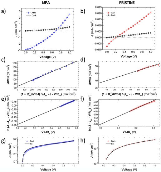 These equations allow extracting the ideality factors and with a linear regression (Equation (4)), if is taken as the x-variable. Equation (5) allows to easily extract current J0 from the y-intercept and using the best fitting value of previously obtained through Equation (4). The fitting curves (black continuous lines) using Equations (4)–(5) to experimental data (colored symbols) are shown in Figure 4c,d for MPA-treated and Figure 4d,f for pristine photovoltaic devices.