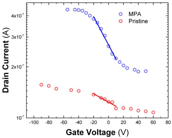 Transfer curves of processed CsPbBr3 PNCs-based FET devices treated with MPA (blue curve) and pristine (red curve).