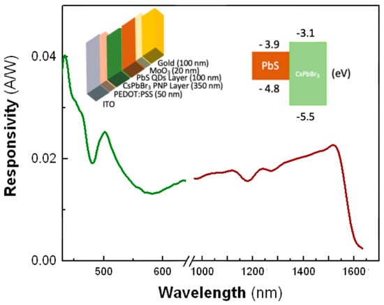 Figure 7 shows the responsivity curve of our tandem-like prototype photodiode in the visible and near-infrared spectral regions. Device architecture and band alignment schemes are displayed in the inset of Figure 7. The MPA ligand exchange was carried out to the whole structure after the deposition of both PNC and QD films with the same parameters used in the case of Schottky-heterostructure based on single layers of CsPbBr3 PNCs. The highest responsivity is found for visible wavelengths (green curve in Figure 7): 40 and 25 mA·W−1 at 430 nm and the exciton absorption resonance of CsPbBr3 PNCs, respectively. Furthermore, the tandem photodetector exhibits a noticeable response in the near-infrared spectral region due light absorption of PbS QDs (red curve in Figure 7), reaching a second maximum of around 20 mA·W−1 at 1550 nm. While in this spectral range the obtained responsivity is one order of magnitude smaller than previously reported results in single PbS QD-Schottky heterojunctions fabricated in a similar way [], it is worth to remark the significantly thinner (≈100 nm) PbS layer used in the tandem photodiode. The present device is a proof of concept of the feasible integration of two complementary nanomaterials that must be further optimized in a number of different ways (thicknesses of the stacked layers, PNC and PbS bandgaps, photodiode architecture, …) according to the application (optical sensors, visible-NIR cameras, photoreceivers or multiwavelength LEDs for integrated photonics, solar cells, …).